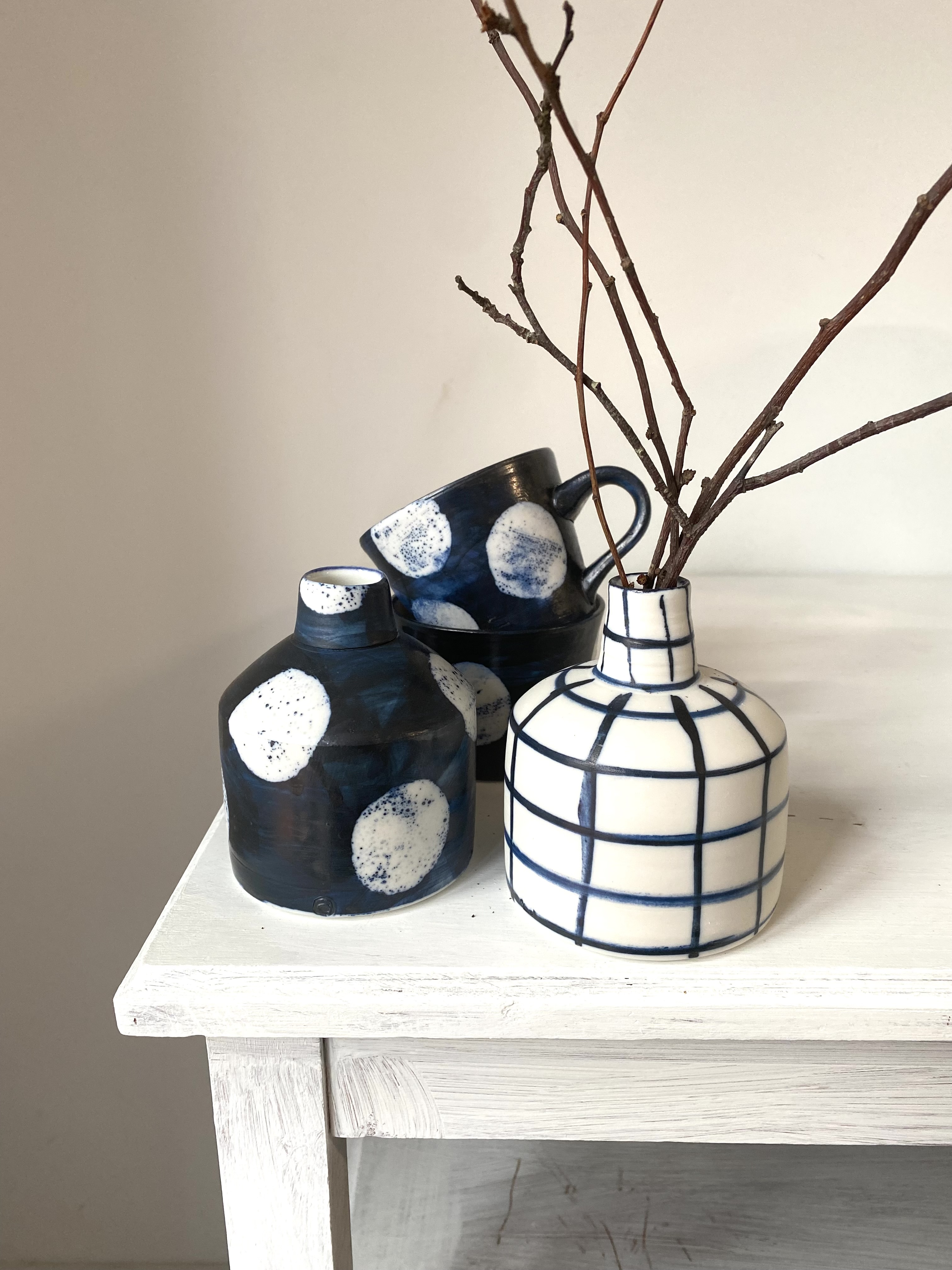 continuing with porcelain thrown forms and cobalt oxide brushwork…. this week pushing to try these ideas on a canvas with acrylic paints…. loving the physical energy of making marks.